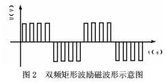 常規(guī)電磁流量計(jì)所應(yīng)用的低頻方波勵(lì)磁方式的勵(lì)磁電流頻率通常為工頻的1/4~1/10。目前深井(6000m以上)的固井施工中所使用泥漿的密度大多在1.8g/cm³以上,流速高達(dá)25m/s,所用的泥漿又是固液兩相低導(dǎo)率流體,雖然高壓下能消除非牛頓流體所帶來(lái)的測(cè)量誤差,但測(cè)量管內(nèi)會(huì)產(chǎn)生隨流量增加而頻率增加的隨機(jī)干擾噪聲。經(jīng)測(cè)定,在DN50測(cè)量管內(nèi),所用的泥漿密度為2.0g/cm³,流速在10~15m/s范圍內(nèi),測(cè)量管內(nèi)的流動(dòng)噪聲主要為尖峰狀的泥漿流噪聲,量級(jí)在mv級(jí),頻率集中在25Hz以下,如圖1所示。在勵(lì)磁頻率較低時(shí),泥漿干擾的數(shù)量級(jí)較大,高頻時(shí)干擾數(shù)量級(jí)較小,具有1/f的頻譜特性。另外,施工現(xiàn)場(chǎng)敲擊和震動(dòng)所帶來(lái)的低頻噪聲,也會(huì)影響電磁流量計(jì)的計(jì)量精度。提高勵(lì)磁電流頻率可以規(guī)避和抑止這些干擾,以提高電磁流量傳感器輸出的信噪比,但會(huì)犧牲電磁流量計(jì)的零點(diǎn)穩(wěn)定性。本文提出新的一種勵(lì)磁方式,采用雙頻矩形波作為勵(lì)磁信號(hào)。其勵(lì)磁電流波形是在低頻矩形波上疊加高頻矩形波,用兩種采樣頻率分別得到高頻和低頻兩種流量信號(hào)。如圖2所示,高頻部分是80Hz的矩形波,外包絡(luò)線是10Hz的低頻矩形波。這樣,能克服單一低頻矩形波勵(lì)磁存在的泥漿流動(dòng)噪聲,同時(shí)又能保證零點(diǎn)的穩(wěn)定性,提高流量計(jì)的計(jì)量穩(wěn)定性和響應(yīng)速度。