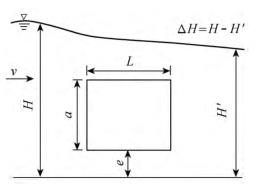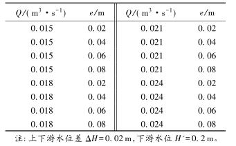 有限水域的浮體結構在不同來流動水中運行時,浮體結構位置的改變會對流場產生影響,從而影響浮體結構的泄流能力以及穩(wěn)定性。試驗過程中固定浮體結構的體型不變(長L=0.20m,寬B=0.30m,高a=0.10m),分別選取4種不同來流流量Q及浮體結構位置e,控制浮體結構在上、下游水位不變的條件下進行試驗,具體試驗參數設計及說明見表1以及圖2。