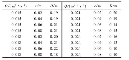 表3中,當來流流量較小時(Q=0.015m3/s),回流區(qū)的長度D隨著浮體結構位置的增大逐漸增大;當來流流量較大時(Q=0.024m3/s),回流區(qū)的長度卻隨著浮體結構位置的增大呈現減小的趨勢。試驗過程中,當浮體結構位置較高且來流較小時,浮體結構上下部區(qū)域的主流流速較小,回流區(qū)范圍較大;浮體結構位置不變時,來流流量增大,回流區(qū)長度減小。來流增加,下泄水流流速較大,并迅速將回流區(qū)內的水流帶入下游區(qū)域,因此回流區(qū)長度反而呈現減小趨勢。