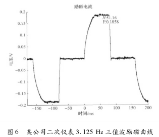 *先,采用某公司生產(chǎn)的二次儀表匹配一次儀表進(jìn)行勵(lì)磁。該二次儀表采用在H橋低端設(shè)置恒流晶體管進(jìn)行恒流控制的方法,其勵(lì)磁曲線結(jié)果如圖6所示,勵(lì)磁頻率為3.125Hz,勵(lì)磁方式為三值波勵(lì)磁,勵(lì)磁電流大約在51.16ms左右進(jìn)入穩(wěn)態(tài),勵(lì)磁電流穩(wěn)態(tài)段波動(dòng)較大。