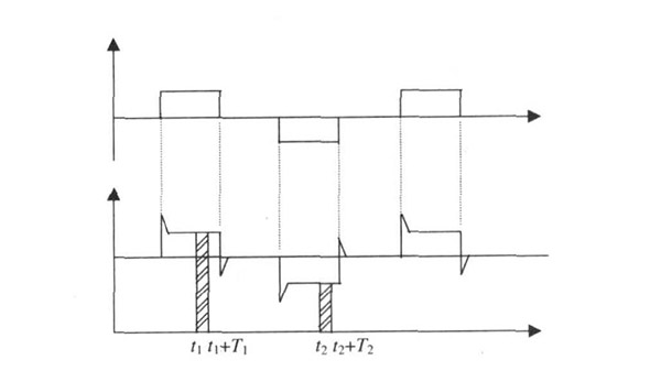 給水廠原水電磁流量計(jì)一般都采用工頻交流電源供電, 其電源電壓的幅值和頻率的變化都會(huì)給給水廠原水電磁流量計(jì)帶來電源性干擾噪聲。對(duì)電源電壓的幅值變化, 因采用多級(jí)集成穩(wěn)壓, 一般而言電源電壓的幅值變化對(duì)電磁流量的測(cè)量精度影響不大。當(dāng)電源電壓的頻率波動(dòng)時(shí), 雖然其波動(dòng)范圍有限, 但對(duì)給水廠原水電磁流量計(jì)測(cè)量精度影響較大。為了解決工頻干擾問題, 實(shí)現(xiàn)對(duì)流體流速感應(yīng)電勢(shì)eab信號(hào)的準(zhǔn)確測(cè)量, 需利用以下基本關(guān)系:①勵(lì)磁周期為工頻周期的整數(shù)倍, 即勵(lì)磁頻率為50/nHz(n為偶數(shù));②正負(fù)勵(lì)磁下的同相位采樣。圖2是對(duì)應(yīng)低頻矩形波勵(lì)磁形式下的典型電勢(shì)信號(hào)形式, 按上述關(guān)系在一個(gè)勵(lì)磁周期下, 若假設(shè)t1 和t2 點(diǎn)為工頻干擾的等效干擾點(diǎn), 且采樣寬度T=T1 =T2 , 則eab的基本算式為:
