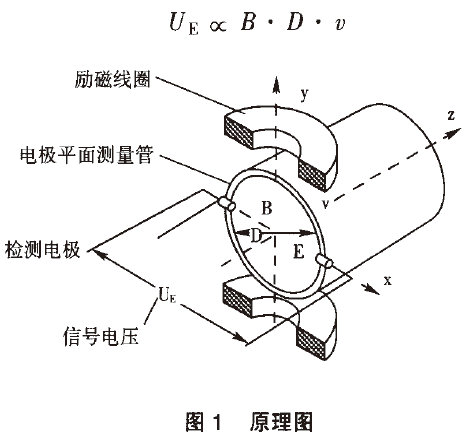 產(chǎn)生與流量成比例的感應電勢,流體中產(chǎn)生的感應電動勢被位于管子徑向兩端的一對電極拾取,該信號電壓uE與磁場強度B、電極間距離D和平均流速穢成正比。磁場強度B和電極距離D是常數(shù),所以信號電壓與平均流速口成正比。計算公式如下: