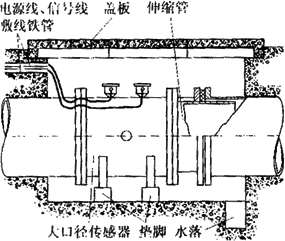 由于大口徑管道在多數(shù)場(chǎng)合下是埋在地下的,因此大口徑傳感器在安裝前應(yīng)做好水泥地坑。圖6-19所示是在給排水系統(tǒng)中常見的安裝形式。水泥地坑應(yīng)有足夠的活動(dòng)空間,側(cè)壁埋有敷設(shè)電纜的鋼管,上有蓋板防止雨淋,下有泄水管以免坑內(nèi)積水而使傳感器侵水。為了拆裝方便,傳感器應(yīng)放在墊腳上,且在下游側(cè)裝有活絡(luò)的伸縮管。圖6-20是熱水流量計(jì)在地下水泥管污水排放系統(tǒng)中的安裝實(shí)例。