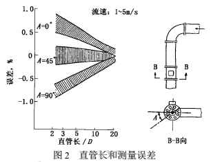 流體流過彎管后,下游產(chǎn)生流速分布畸變,若是兩只鄰近相接的不同平面彎管,除流速分布畸變外還會有漩渦。這些現(xiàn)象要影響裝在下游的大部分類型流量儀表(除容積式等少數(shù)類型外)的測量值,因此通常要求在流量儀表安裝點之前有一定長度直管段,改善進(jìn)入儀表的流動狀況。廢水流量計受彎管影響較小,直管長度要求也遠(yuǎn)低于節(jié)流差壓式、渦街式等其他流量儀表。但是當(dāng)前廢水流量計精度為測量值的0.5%,甚至0.2%~0.4%,即使影響量較小,還是受到人們的關(guān)注。