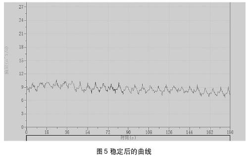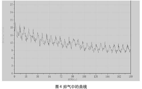 圖4、圖5中所示曲線為測量過程中所截取的集流傘中所聚集的氣相,通過排氣通道排出時(shí)與排出后的測量曲線。測試過程中錄取到的儀器排氣的過程,當(dāng)集流傘完全支開后仍需要開啟流量測試進(jìn)行實(shí)時(shí)檢測,否則可能會(huì)錄取資料失真。