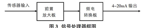 信號處理器對渦街流量傳感器產(chǎn)生的頻率信號經(jīng)過濾波、放大、頻電轉(zhuǎn)換等幾個環(huán)節(jié)處理,*終將頻率信號轉(zhuǎn)換為標準4~20mA信號輸出。信號處理器框圖如圖3所示。