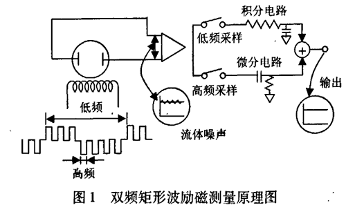 雙頻矩形波勵磁測量原理如圖l所示,一個由高低頻分量迭加而成的電磁場通過勵磁線圈被施加到被測液體中,勵磁波形是在一個低頻矩形波上迭加一個高于市電頻率的矩形波而得到的波形。在產(chǎn)生的電動勢中,低頻分量通過一個大時間常數(shù)的積分電路獲得一個零點穩(wěn)定性好的平穩(wěn)流量信號。而由漿液或低電導率流體產(chǎn)生的低頻噪聲可被不受噪聲影響的高頻采樣電路所抑制,有著同樣時間常數(shù)的流量信號經(jīng)過一個差分電路以確定流速信號的變化,把這兩種不同頻率采樣所得的信號結合起來可獲得一個穩(wěn)定流速信號,該信號不受噪聲干擾,且有較高的零點穩(wěn)定性。