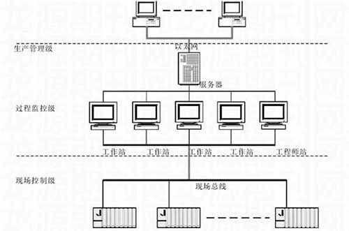 針對(duì)鎢礦選廠生產(chǎn)的實(shí)際需求,這里應(yīng)用相應(yīng)的自動(dòng)化技術(shù),對(duì)自動(dòng)化監(jiān)控系統(tǒng)進(jìn)行了設(shè)計(jì)。在系統(tǒng)設(shè)計(jì)中,遵循“方案合理、技術(shù)先進(jìn)、運(yùn)行可靠、操作方便”的原則,系統(tǒng)整體采用集散控制系統(tǒng),基于現(xiàn)場(chǎng)總線通訊,其整體網(wǎng)絡(luò)構(gòu)架如下: