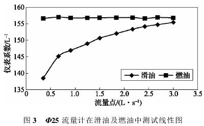 依據(jù)表3測試數(shù)據(jù),經(jīng)計算可得,Φ25流量計在滑油及燃油中測試結(jié)果如表4所示,測試線形圖如圖3所示。