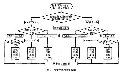 實(shí)際生產(chǎn)中流量一直在某個區(qū)域內(nèi)波動,且其動態(tài)特性不易掌握。從上面的理論中我們能夠讓誤差△£盡可能的小,這樣距我們所需要的理論值%就越接近。而減小誤差需要我們把n取的盡可能大,也就是在生產(chǎn)時間內(nèi)劃分更多的周期去調(diào)節(jié)流量。當(dāng)工控機(jī)根據(jù)排污計(jì)量表傳送回來的信號發(fā)出調(diào)節(jié)變頻器工作頻率的指令后,電機(jī)調(diào)整功率到排污計(jì)量表的實(shí)際測量為一個工作周期,我們知道從指令發(fā)送到實(shí)際測量值返回有一個較大的滯后,如果調(diào)節(jié)的周期時間小于流量計(jì)本身的一個工作周期,那么顯然不可能達(dá)到減小誤差的目的。利用模糊控制思想H。,在控制程序中我們把流量的波動區(qū)域劃分為±缸×Yo,Yo-t-O.3,Yo±0.5四個區(qū)域,其中缸為可調(diào)節(jié)的誤差范圍,生產(chǎn)中我們?nèi)?.015,流量區(qū)域劃分的單位均為t/h。針對不同的區(qū)域采取不同的調(diào)整方案。具體流程如圖3所示。圖中變量Rel表示實(shí)際測量的流量,變量Idea表示理論流量。