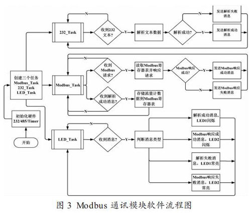 圖 3 為 Modbus 通訊模塊的軟件流程圖,創(chuàng)建的三個(gè)任務(wù)都是以 FreeRTOS 系統(tǒng)的消息(Message)來驅(qū)動(dòng)。