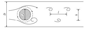 智能渦街流量計(jì)是由漩渦發(fā)生體、頻率檢測(cè)器和信號(hào)轉(zhuǎn)換器等環(huán)節(jié)組成,輸出 4 ~ 20 mADC 信號(hào)或脈沖電壓信號(hào)。其測(cè)量原理是在流動(dòng)的流體中的垂直流動(dòng)方向安放 1 根或多根非流體型阻流體,在一定的流量范圍內(nèi),流體在阻流體兩側(cè)交替地分離、釋放出 2 串頻率正比于管道內(nèi)的平均流速、規(guī)則的、不對(duì)稱有規(guī)律的交替漩渦列,如圖 1 所示,且兩側(cè)漩渦旋轉(zhuǎn)方向相反 。采用檢測(cè)元件測(cè)出漩渦頻率就可以推算出流體的流量。