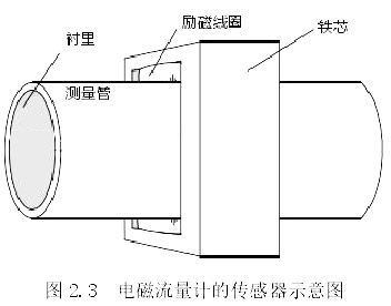 傳感器的主要作用是將通過管道的流量信號進行轉換,將其轉為電動勢。市面上常見的傳感器主要有下圖 2.4 中如測量管、鐵芯、勵磁線圈、襯里等結構。