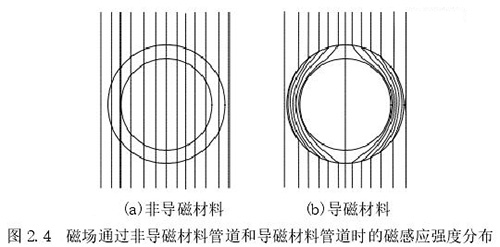 1.測量管:主要是傳感器的管道,該管道由高導電率非導磁材料制成,可保證流體在通過時能夠表現(xiàn)出自身的電磁效應,在該管道內中安裝了內襯。使用非導磁材料的原因是保證勵磁線圈中所產生的磁場不會順著管道流走,確保測量管道內部產生明顯的磁感應線,下圖 2.4 中展示了利用非導磁材料和導磁材料管道中所產生磁感應線的情況。