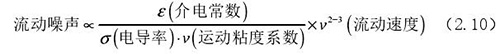 流動(dòng)噪聲主要出現(xiàn)在低電導(dǎo)率流體的檢測(cè)中,由輸出端輸出的直流極化電壓時(shí)常出現(xiàn)左右擺動(dòng)的現(xiàn)象,而此種擺動(dòng)的電壓被稱為流動(dòng)噪聲。上式(2.5)中可以觀察了解到流體電導(dǎo)率和流動(dòng)噪聲呈現(xiàn)出負(fù)相關(guān)關(guān)系,由此可以了解到在進(jìn)行低電導(dǎo)率的計(jì)算中需要重點(diǎn)考慮位移電流。