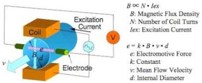 基本上,當(dāng)導(dǎo)電液體流過磁場時,會感應(yīng)出電壓。為了測量該產(chǎn)生的電壓(與流動的液體的速度成正比),使用了兩個彼此相對安裝的不銹鋼電極。