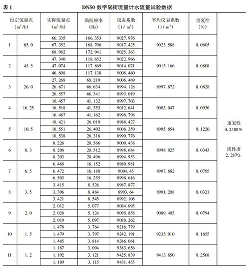 將本文實(shí)現(xiàn)的數(shù)字煙氣流量計(jì)在上述 50mm 口 徑( 簡稱 DN50) 的水流量試驗(yàn)裝置上進(jìn)行試驗(yàn)。先在其正常流量范圍內(nèi)進(jìn)行試驗(yàn),流量從大到小逐漸降低,之后不斷探求其所能測量的*小流量。每個(gè)流量點(diǎn)試驗(yàn)三次,計(jì)算其重復(fù)性、平均儀表系數(shù)和線性度。水流量試驗(yàn)數(shù)據(jù)如表 1 所示。