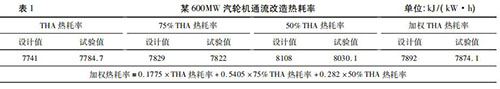 隨著火電機(jī)組利用小時(shí)數(shù)降低,發(fā)電企業(yè)一般都會(huì)根據(jù)不同負(fù)荷工況下的實(shí)際運(yùn)行小時(shí)數(shù),確定機(jī)組熱耗率考核權(quán)重,形成*終的加權(quán)熱耗率考核值。考核加權(quán)熱耗率對(duì)設(shè)備廠家末級(jí)葉片選型、高壓調(diào)門與高壓缸匹配性提出了更高的要求,在當(dāng)前負(fù)荷率偏低的情況下增強(qiáng)了發(fā)電企業(yè)的競(jìng)爭(zhēng)力。然而,僅僅對(duì)加權(quán)熱耗率進(jìn)行考核是不夠的,設(shè)備廠家為了增強(qiáng)自身的競(jìng)爭(zhēng)力,往往會(huì)把全部重點(diǎn)放在如何降低占比大的低負(fù)荷熱耗率上而犧牲高負(fù)荷的熱耗率,這無(wú)疑削弱了發(fā)電企業(yè)的適應(yīng)性。某廠一臺(tái) 600MW 汽輪機(jī)通流改造時(shí)僅對(duì)加權(quán)熱耗率進(jìn)行考核,THA 熱耗率要高出設(shè)計(jì)值43. 7 kJ/( kW·h) ,詳見(jiàn)表 1。通流改造時(shí)既要對(duì)加權(quán)熱耗率進(jìn)行考核,也要對(duì) THA工況時(shí)熱耗率進(jìn)行考核。