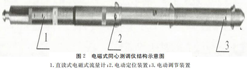 電磁式同心測調(diào)儀是同心分層注水工藝技術(shù)的關(guān)鍵儀器,其設(shè)計理念:集成流量測試與水量調(diào)節(jié)于一體,實(shí)現(xiàn)測調(diào)同 步;動力傳遞設(shè)計為同心降速機(jī)制,機(jī)械結(jié)構(gòu)簡單,動力傳遞效率高,測調(diào)穩(wěn)定性高。主要包括以下結(jié)構(gòu),如圖2所示。