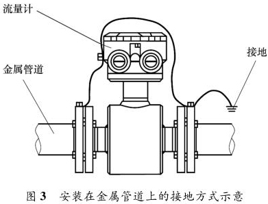 乙醇管道流量計安裝在金屬管道上,安裝時將金屬管道與乙醇管道流量計相連接,接地線再接入接地網(wǎng),如圖 3 所示。