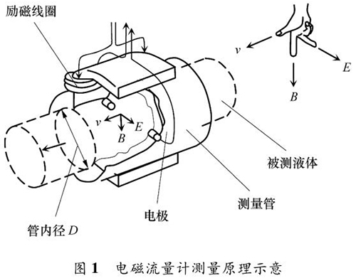液體流量計的測量原理如圖 1 所示。根據(jù)法拉*電磁感應定律,導電液體在磁場中流動會產(chǎn)生電動勢 E,它與磁感應強度 B、導電液體平均流速 v 成一定比例關系: