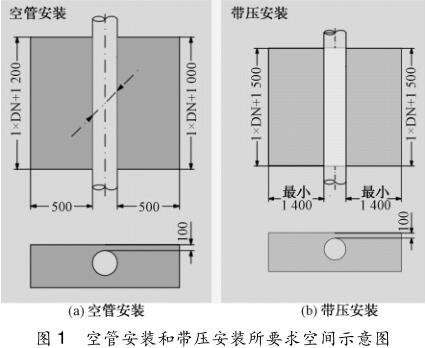 (1)要確認(rèn)在用液體電磁流量計的管壁厚度及內(nèi)襯材料特性,保證換能器在管段內(nèi)壁的突出長度;(2)用氣焊切割液體電磁流量計外殼時,一定要在管道內(nèi)充滿水的情況下(*好是帶壓并繼續(xù)保持管內(nèi)水在運行流動的狀態(tài))進行,以免內(nèi)襯受熱凸起變形影響流態(tài);(3)要有足夠安裝空間(流量井),可以用原有的流量井,但管壁與流量井墻壁*小距離不小于 500 mm,流量井長不小于 1. 5 倍管徑。超聲波流量計空管安裝和帶壓安裝要求空間如圖 1 所示。