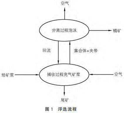 浮選是依據(jù)礦物原料表面的化學(xué)性質(zhì),向待浮選的礦漿中加入浮選藥劑和空氣,使其與礦漿充分融合,并根據(jù)各礦物原料的黏附程度的不同,分選出不同的礦物。浮選過程一般分為礦漿碰撞、黏附、上浮以及精煤溢出四個階段。礦物原料在浮選藥劑的作用下,與 空氣發(fā)生器產(chǎn)生的小氣泡發(fā)生充分碰撞,進行礦物捕集。利用礦物間的疏水特性,礦物粘附于氣泡表面,氣泡不斷上浮,形成精礦泡沫層,精礦溢出浮選柱;由于尾礦的親水特性,尾礦沉入底部并排出。浮選流程如圖1所示。