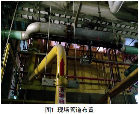 考慮兩臺(tái)機(jī)組管線(xiàn)布置和運(yùn)行狀態(tài)完全一致, 下面僅提供#1機(jī)組的測(cè)量分析。圖1中頂軸油管上 部水平管道為凝結(jié)水補(bǔ)水管道。