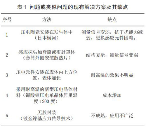 3) 當(dāng)前技術(shù)系統(tǒng)存在的問題。 由于目前使用的傳感器檢測感應(yīng)元件為壓電陶瓷,其極化時(shí)居里溫度大約420 ~ 460℃,因此只能在低于 240℃介質(zhì)中使用,一旦被測量介質(zhì)的溫度高于 240℃,液態(tài)液化氣流量計(jì)傳感器便會因壓電陶瓷達(dá)到居里點(diǎn),絕緣電阻降低,壓電信號變?nèi)醵А?br /> 4)問題或類似問題的現(xiàn)有解決方案及其缺點(diǎn)(見表 1)。