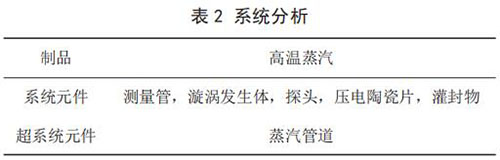 建立已有系統(tǒng)的功能模型(見圖 1)。通過功能模型分析,描述了系統(tǒng)元件及其之間的相互關(guān)系,并得出導(dǎo)致傳感器耐受溫度不足問題的功能因素:高溫蒸氣對測量管傳熱;測量管對探頭傳熱;探頭對灌封物傳熱;灌封物對壓電陶瓷片傳熱;高溫蒸氣對探頭傳熱。