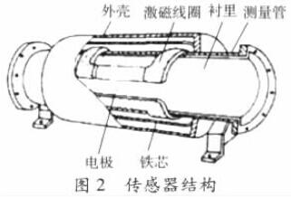 電磁流量計(jì)由流量傳感器和轉(zhuǎn)換器兩部分組成。傳感器典型結(jié)構(gòu)示意如圖2,測(cè)量管上下裝有激磁線圈,通激磁電流后產(chǎn)生磁場(chǎng)穿過(guò)測(cè)量管,一對(duì)電極裝在測(cè)量管內(nèi)壁與液體相接觸,引出感應(yīng)電勢(shì),送到轉(zhuǎn)換器。激磁電流則由轉(zhuǎn)換器提供。