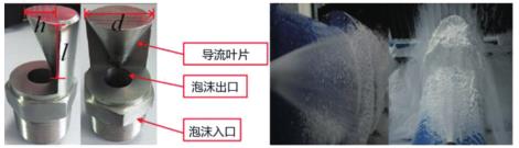 圖 1 為電弧風扇噴嘴的結構和噴霧,一種新型的噴嘴主要由一個智能渦街流量計入口、出口和導流葉片組成。出流口的圓柱形設計降低了湍流強度。導流葉片類似于流線型尾部,產(chǎn)生類似于弧形風扇形狀的智能渦街流量計噴霧,其形狀類似于掘進機的粉塵源。