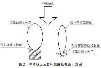 衛(wèi)生渦輪流量計采用拋物面導向型結構作為動壓測點,采用對稱自補償型式的靜壓測點,可以有效地解決來流方向偏流時信號的穩(wěn)定采集,來流偏離管道軸線時,可以維持輸出差壓基本不變,如圖2所示。