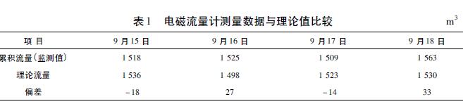 電磁流量計與V錐流量計都適用于環(huán)境較惡劣的場合。在測量精度上,V錐流量計要比電磁流量計高,而且安裝更靈活,對上、下游直管段的要求很短,但V錐流量計要比電磁流量計昂貴得多。電磁流量計的測量精度雖不及V錐流量計,但在此應用中完全可以滿足要求,而且運行穩(wěn)定性和流量數(shù)據(jù)準確度也很好。表1是使用電磁流量計對園區(qū)某個企業(yè)監(jiān)測點連續(xù)4天的累積流量監(jiān)測數(shù)據(jù)與理論流量的對比。