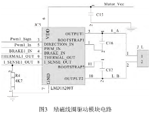 由于探頭尺寸較小,所產(chǎn)生的勵(lì)磁電流很弱,由于探頭尺寸較小,所產(chǎn)生的勵(lì)磁電流很弱,要處理這樣的信號(hào),則后續(xù)的放大電路要有足夠高要處理這樣的信號(hào),則后續(xù)的放大電路要有足夠高的輸入阻抗和較大的增益,來(lái)保證傳感器的靈敏度的輸入阻抗和較大的增益,來(lái)保證傳感器的靈敏度及抗干擾性;為了防止交流及抗干擾性;為了防止交流50Hz的工頻干擾,選的工頻干擾,選用方波電流作為勵(lì)磁電流,其頻率選用用方波電流作為勵(lì)磁電流,其頻率選用12.5Hz,它是1/4的工頻頻率,這樣可有效地抑制工頻干擾。勵(lì)磁信號(hào)在單片機(jī)內(nèi)部生成,從*勵(lì)磁信號(hào)在單片機(jī)內(nèi)部生成,從*26腳輸出12.5Hz方波信號(hào),接到勵(lì)磁線圈的驅(qū)動(dòng)模塊電路方波信號(hào),接到勵(lì)磁線圈的驅(qū)動(dòng)模塊電路IC5(LMD18200T LMD18200T)的3腳信號(hào),它的內(nèi)部采用腳信號(hào),它的內(nèi)部采用H橋式驅(qū)動(dòng),送出勵(lì)磁電流加到其橋式驅(qū)動(dòng),送出勵(lì)磁電流加到其2腳和10腳之間的勵(lì)磁線圈上。在勵(lì)磁線圈L上形成20~30mA方波電流,它與控制方波電壓同步。使流體運(yùn)動(dòng)切割波電流,它與控制方波電壓同步。使流體運(yùn)動(dòng)切割磁力線產(chǎn)生的方波電壓與勵(lì)磁電流完全保持同步, 磁力線產(chǎn)生的方波電壓與勵(lì)磁電流完全保持同步,這樣也便于在接收放大電路中信號(hào)的同步解調(diào)。電路如圖3所示。